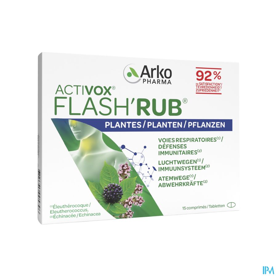Activox Flash Rub Comp 15 est un complément alimentaire disponible en pharmacie. Il ne peut se substituer à un mode de vie sain et à une alimentation variée et équilibrée. Ne prenez pas plus que la dose quotidienne recommandée indiquée sur l'emballage. Demandez conseil à votre pharmacien. Tenir hors de portée des enfants.